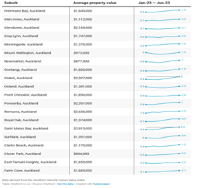 OneRoof没有给每个月具体数字变化,但提供了过去几个月变化的趋势,从图中可以看出奥克兰部分区域开始上涨,很多还是下跌。