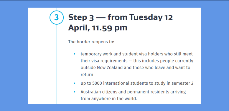 【时新网编译报道】新西兰移民局于今年2月初公布了边境开发分五步走的计划,前两步已经进入了实施,本月12号,也就是下周二,开始实施第三步,对持短期工作签证和学生签证的外国人开放。如果一切按计划进行,新西兰边境将于今年10月份全面开放。为了让大家对这一计划有准确和深入的了解,时新网专门进行专题报道,供准备到新西兰旅游、读书或工作的人们参考。
