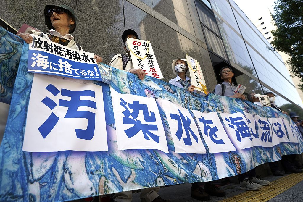 People hold banners reading "Don't dump contaminated water into sea!" outside TEPCO headquarters, Tokyo, Japan, May 16, 2023. (CFP)