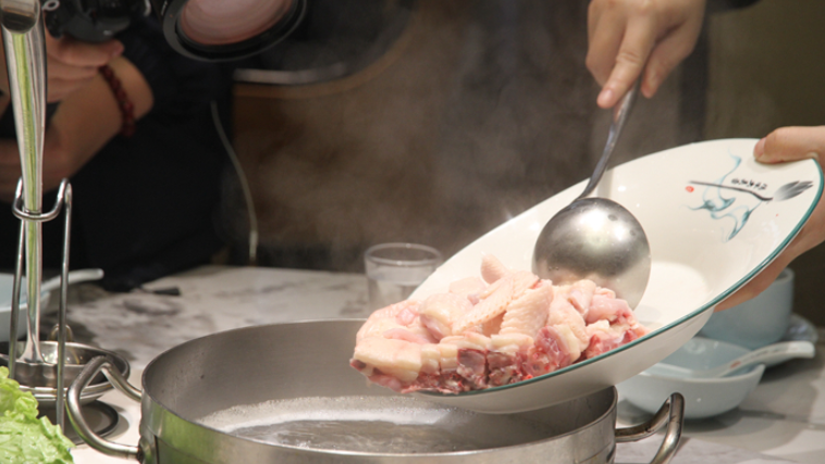 将生鲜文昌鸡肉倒入沸腾的椰子水汤底中。(图/中新网)
