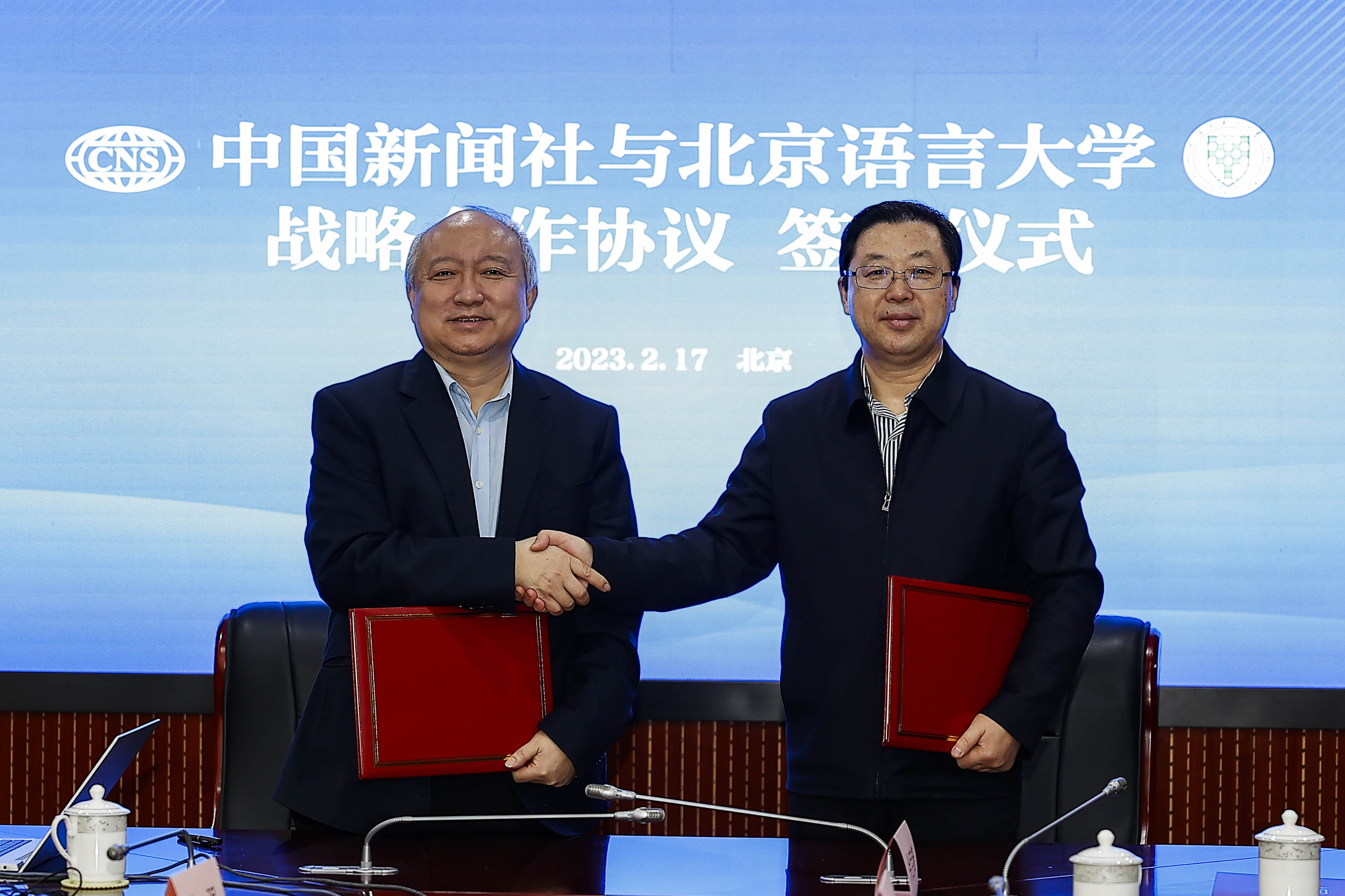 图为中国新闻社总编辑张明新(左)与北京语言大学校长刘利在签约仪式上合影。(图/中新社)