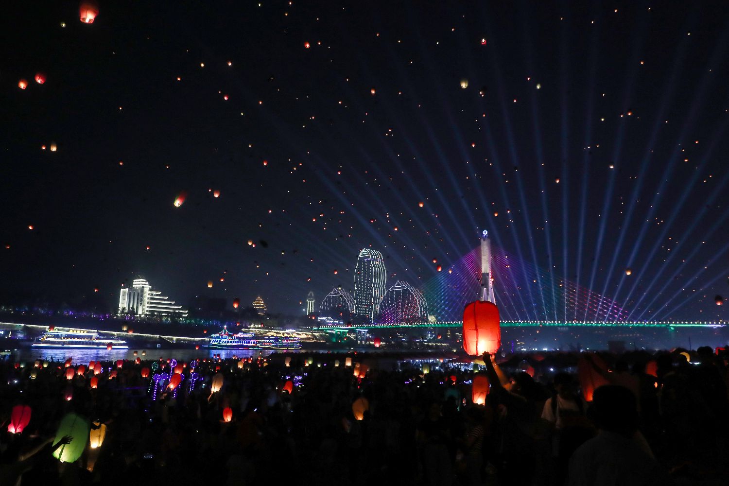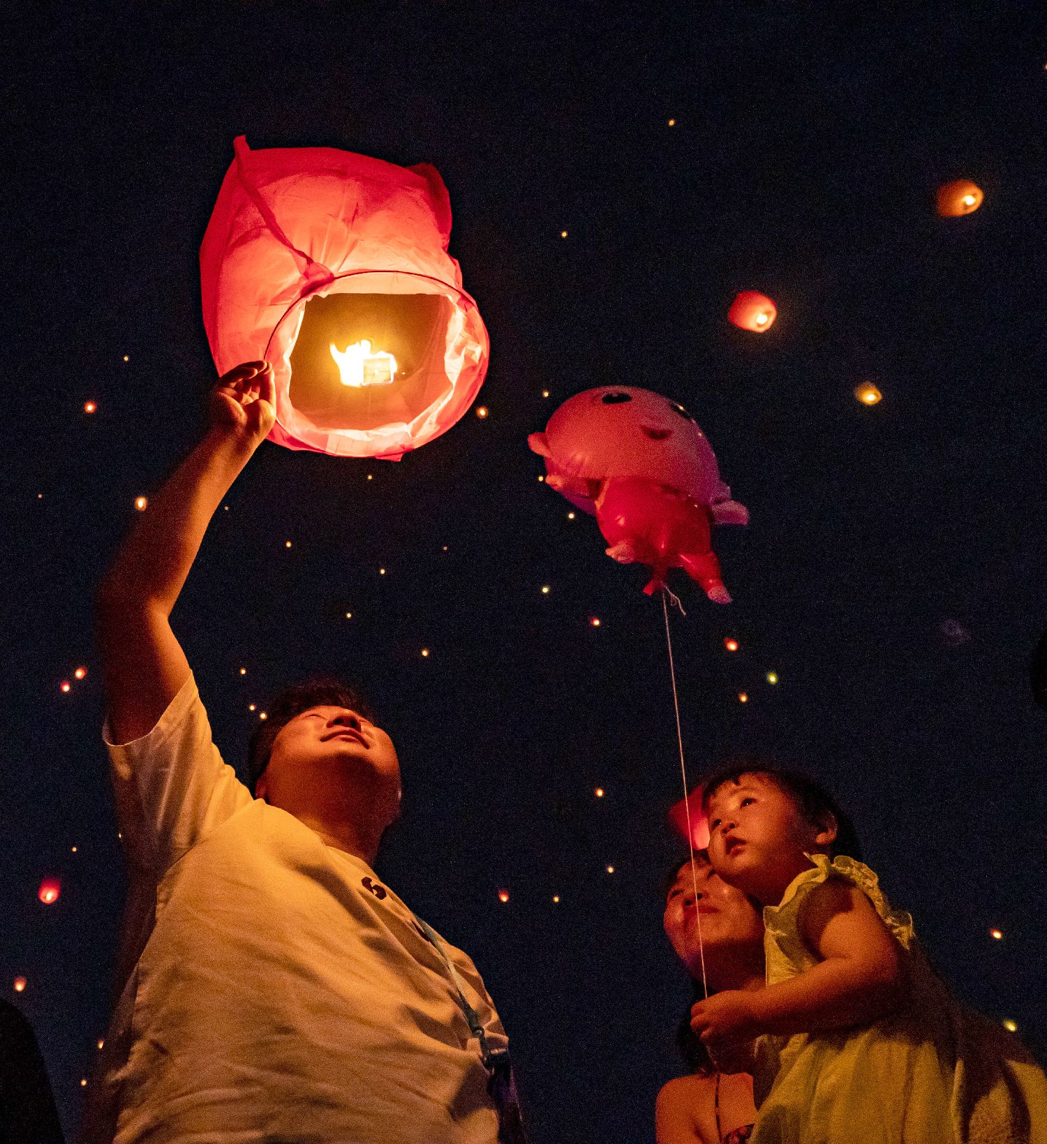 4月13日,云南省西双版纳傣族自治州迎来为期3天的泼水节。节日期间当地将举行燃放孔明灯、泼水等多种活动,庆祝傣历新年。傣历新年孔明灯放飞当晚,人们聚集到澜沧江边,手执孔明灯,写上心愿,点燃灯烛,把一盏盏孔明灯放飞,西双版纳的夜空顿时“繁星”点点,绚丽夺目,千盏万盏的孔明灯承载着人们美好祝愿慢慢飞向天际。