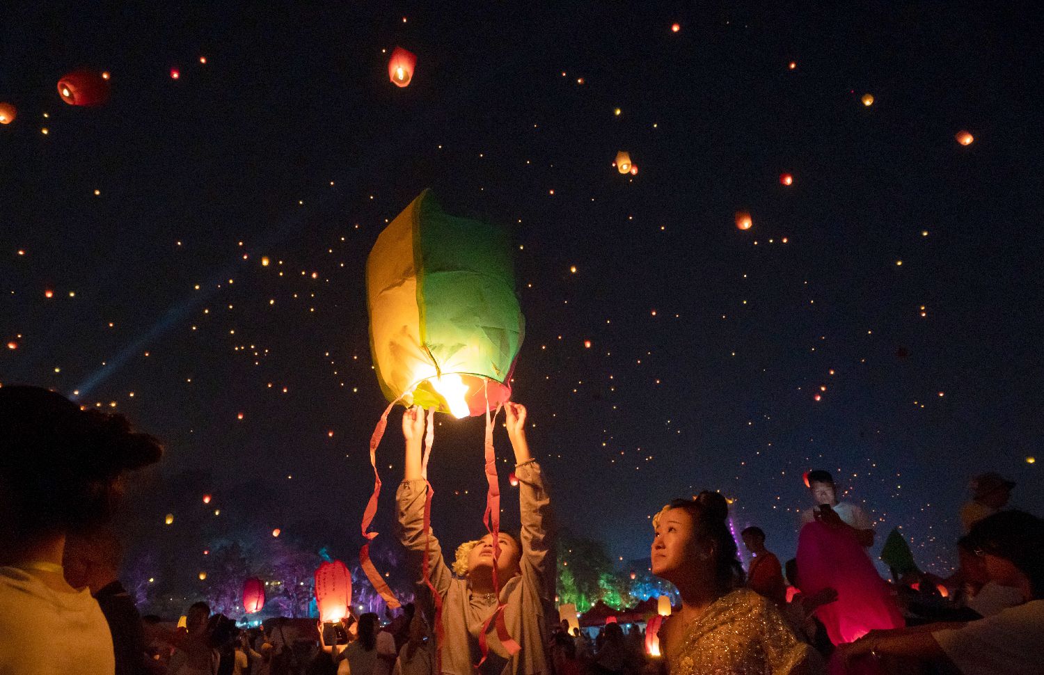 4月13日,游客在云南省景洪市放飞孔明灯祈福许愿。(新华社)