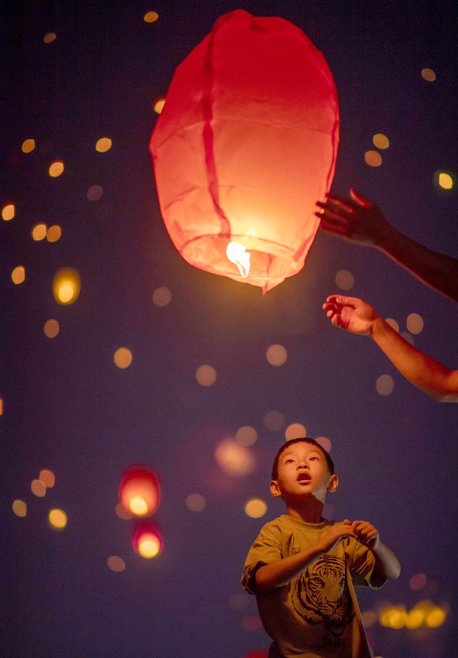 4月13日,一名小朋友在云南省景洪市澜沧江边观看孔明灯放飞。(新华社)