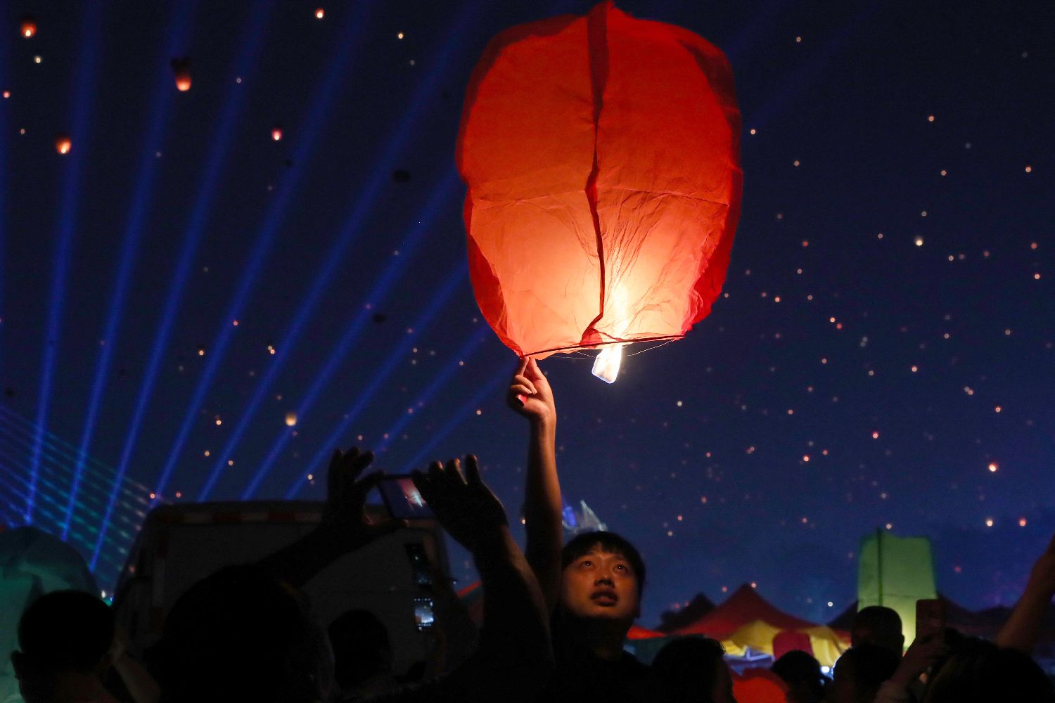 4月13日,游客在云南省景洪市澜沧江边放飞孔明灯祈福许愿。(新华社)