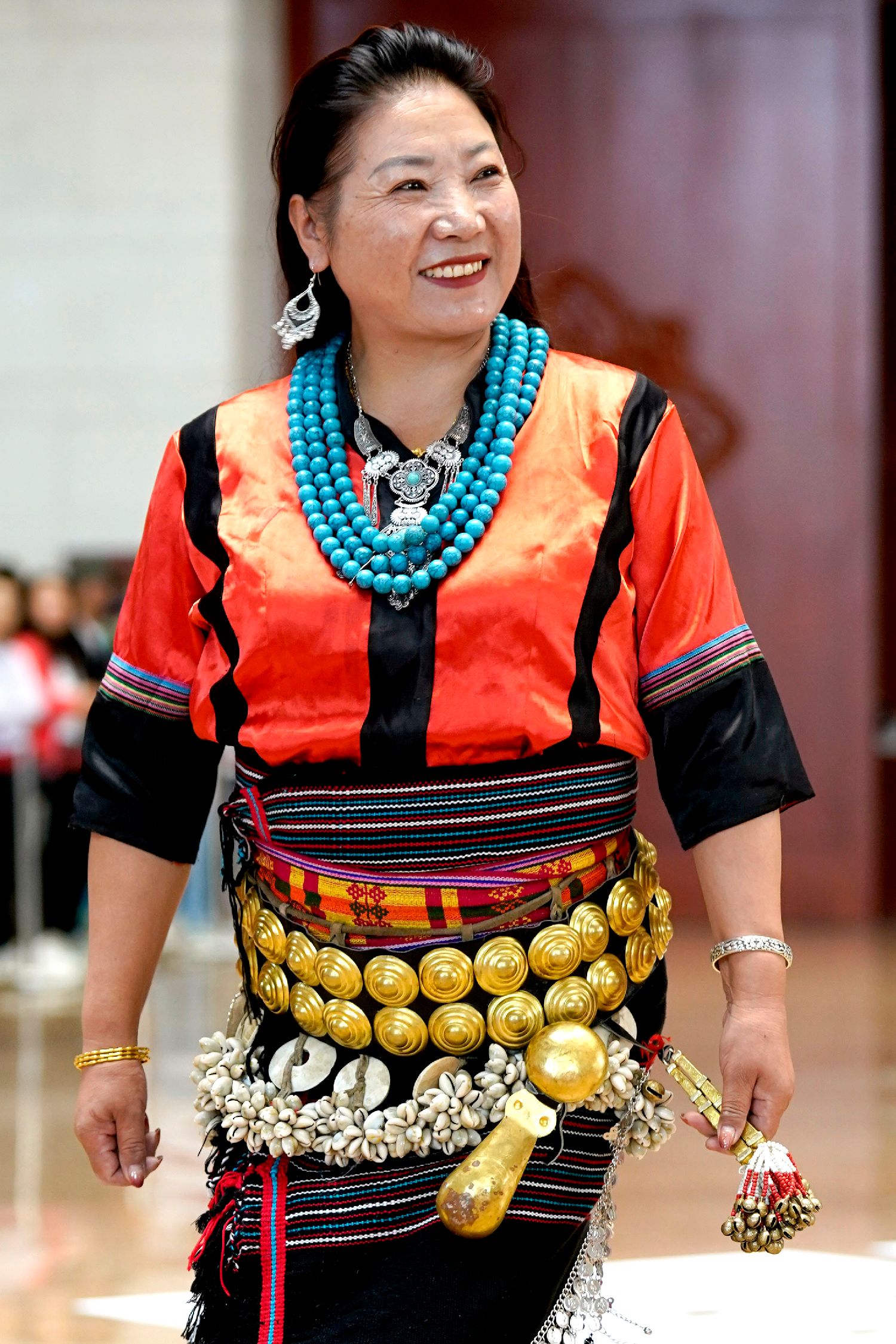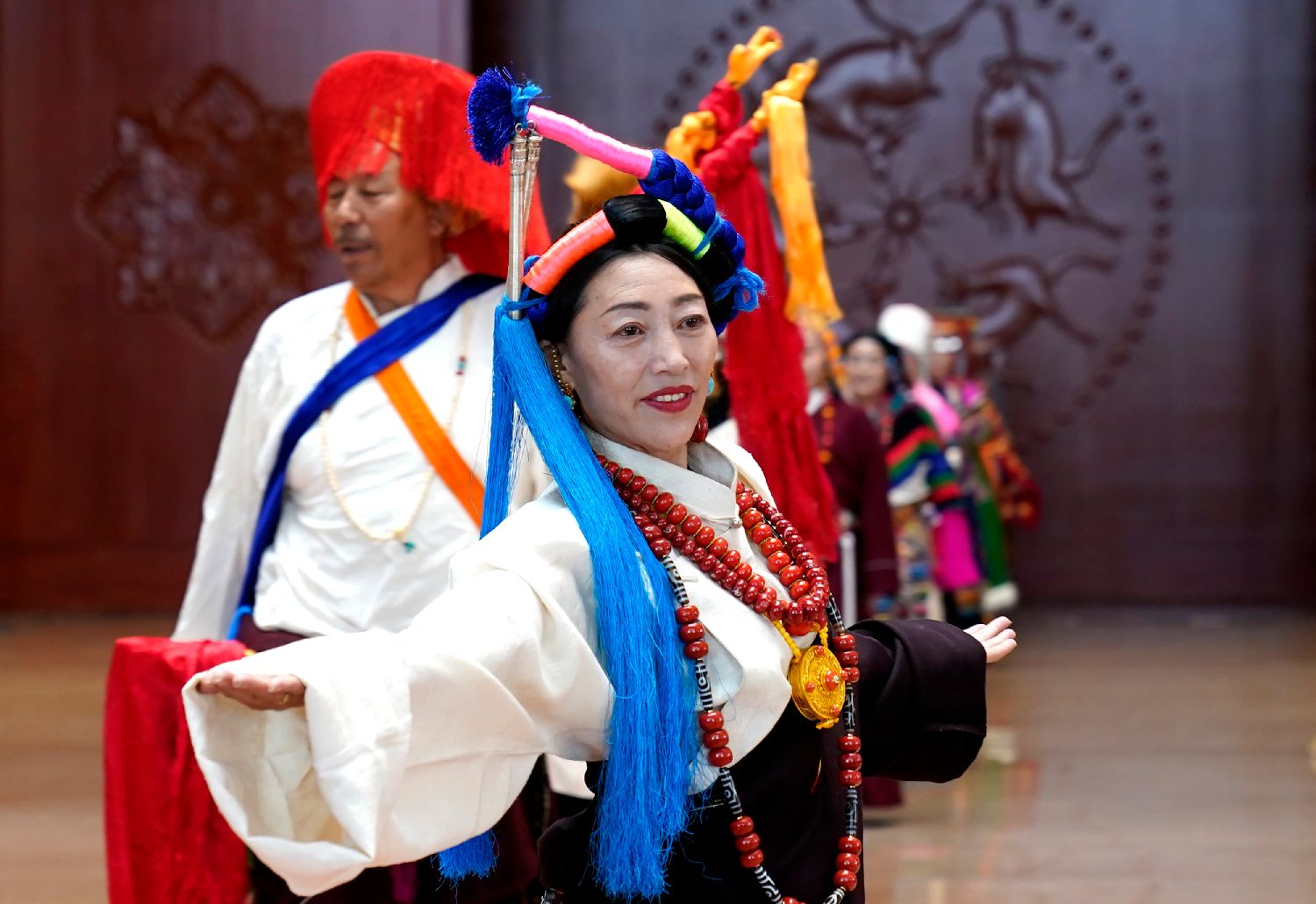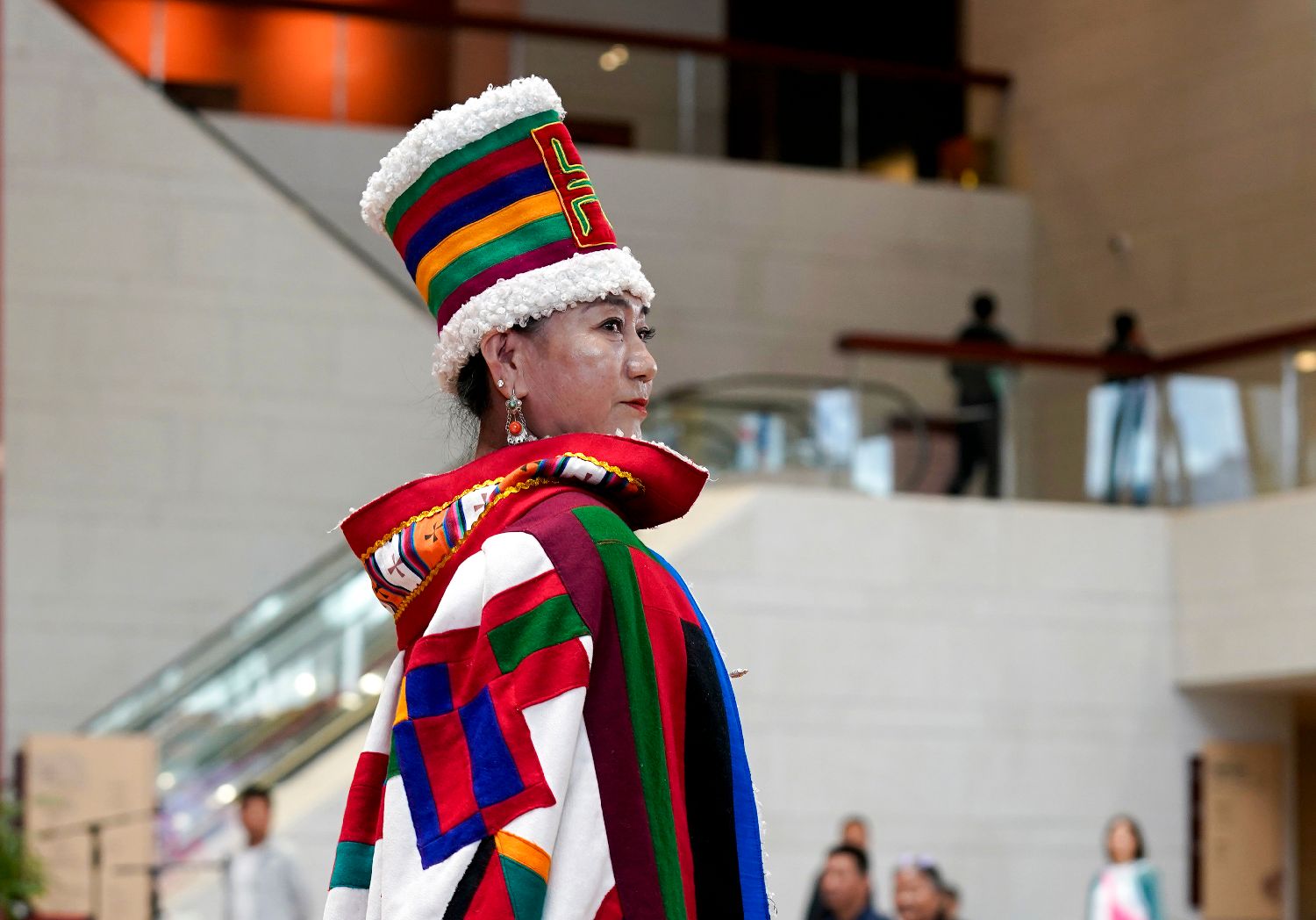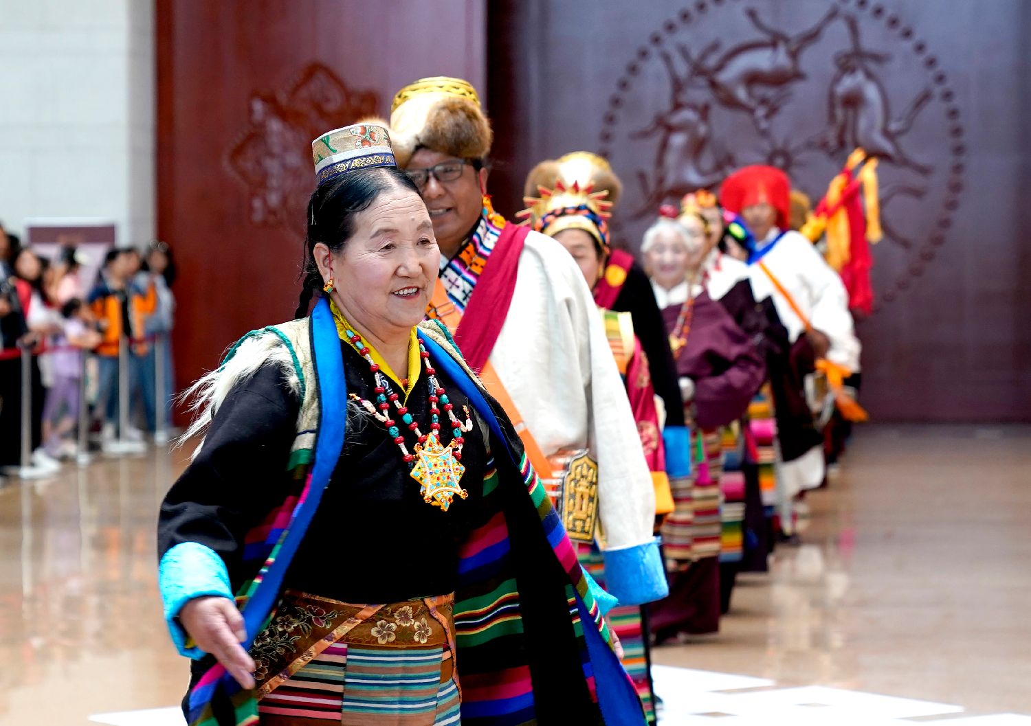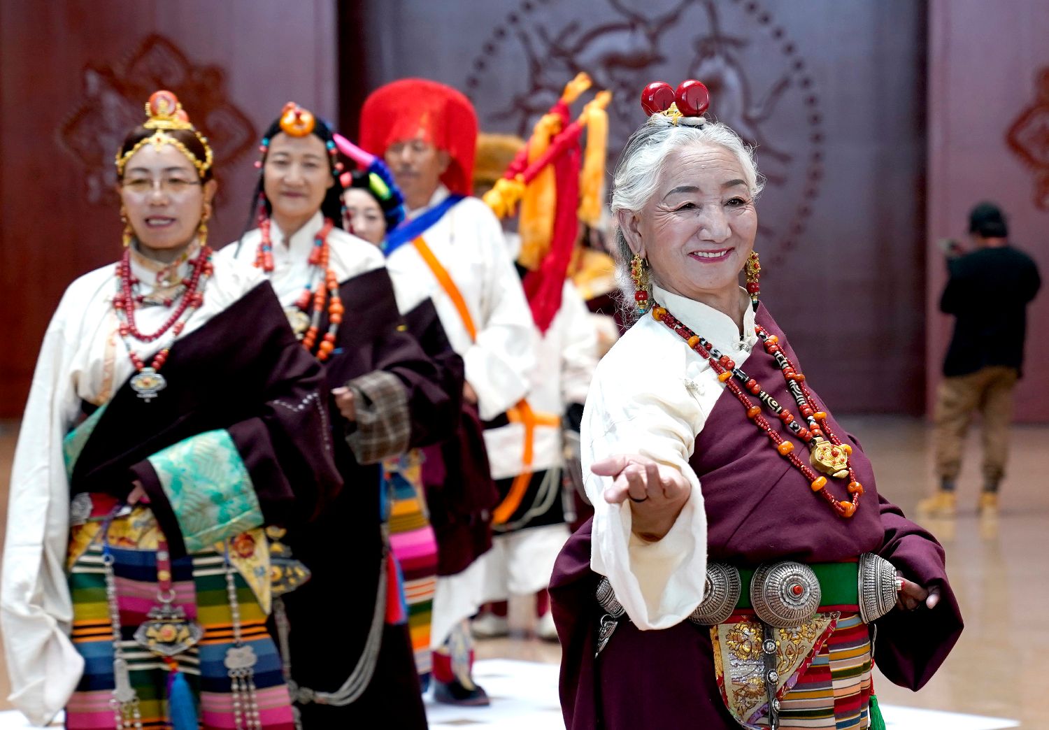 8月15日,西藏拉萨,西藏博物馆联合拉萨市妇女联合会举办源·韵——西藏传统服饰活态展示活动,为参观者提供西藏民俗活态体验。活动现场按照西藏七市地、农区、牧区、林区服饰的顺序展示了40套藏族服饰。图为模特进行服装展示。(中新社)