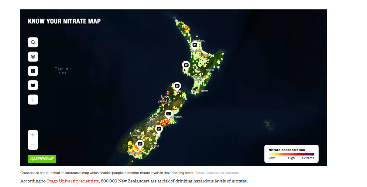 RNZ报道,这项“了解你的硝酸盐”地图,允许用户搜索有关当地硝酸盐含量的信息——两年来,绿色和平组织一直在进行免费的硝酸盐检测,从而建立了一个数据集,显示家庭饮用水供应中的硝酸盐含量。