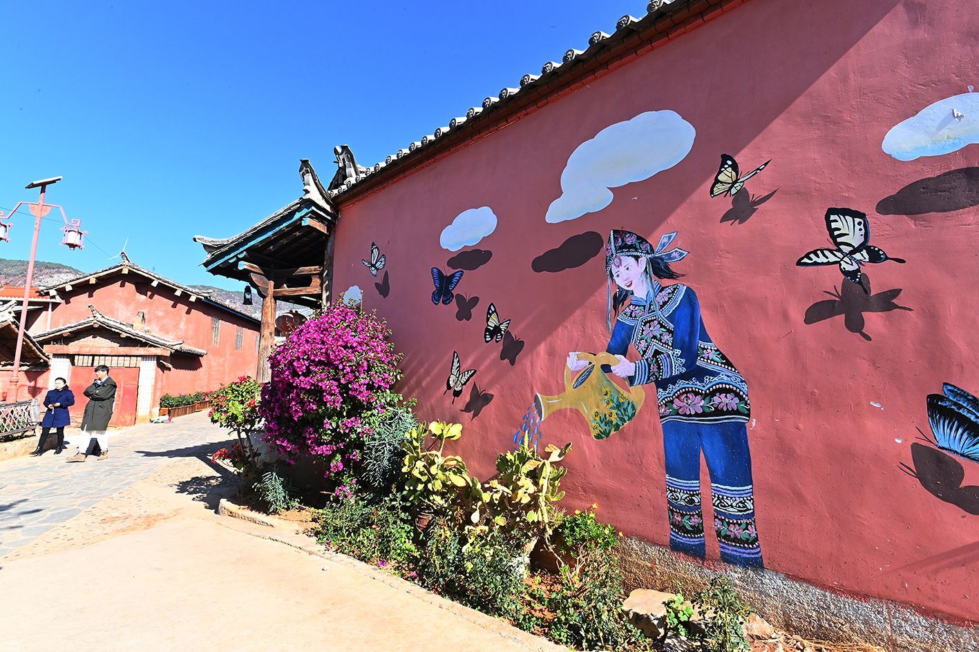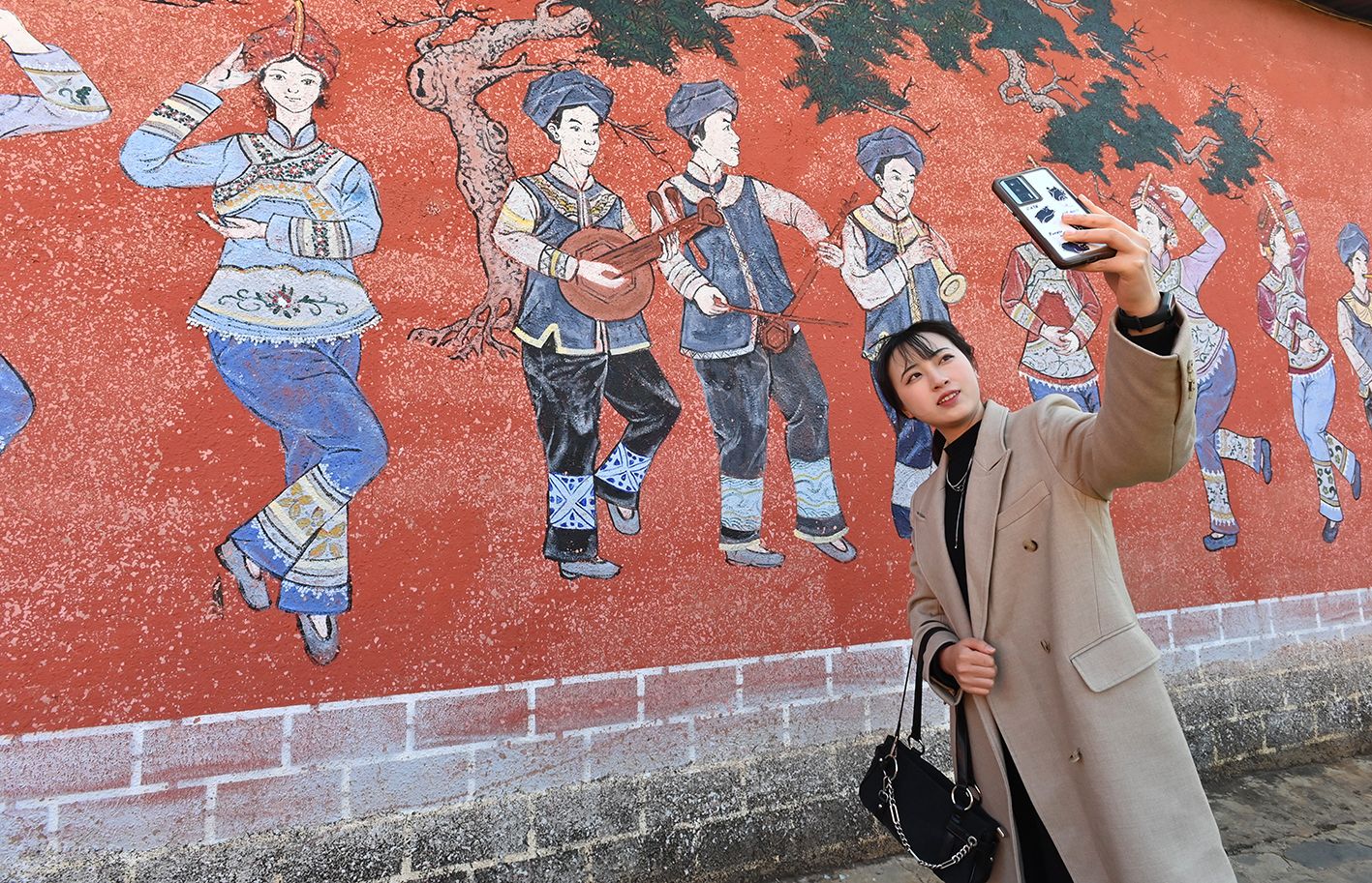 2月1日,记者走进中国最大的彝族自然村——攀枝花市仁和区平地镇迤沙拉村,感受该村的无穷魅力。图为游客在村里拍照留念。(中新社)