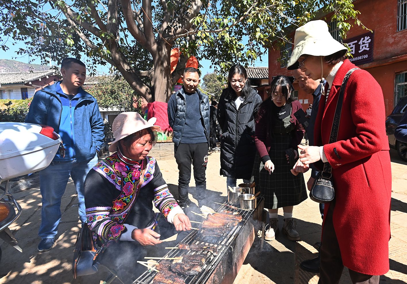 迤沙拉村位于四川省“南大门”,共有604户2225人,其中彝族占总人口96%,是中国最大的彝族自然聚居村,有“中国彝家第一村”之称。图为村民马青莲(左二)向游客售卖烧烤。(中新社)